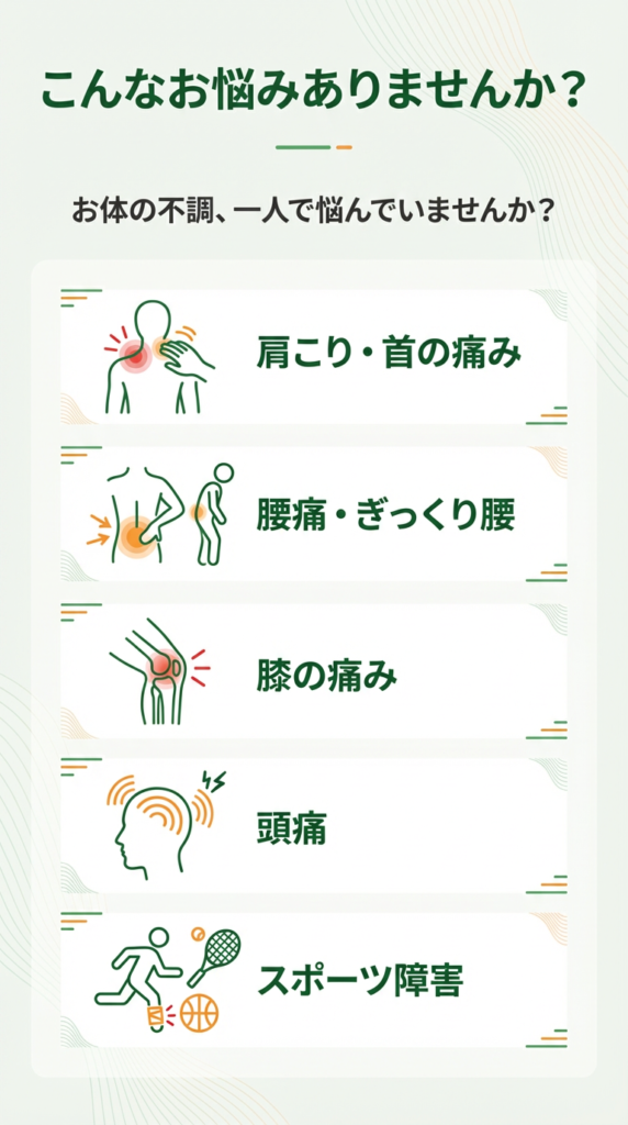 肩こり・腰痛をはじめ、首や背中の痛みなど、